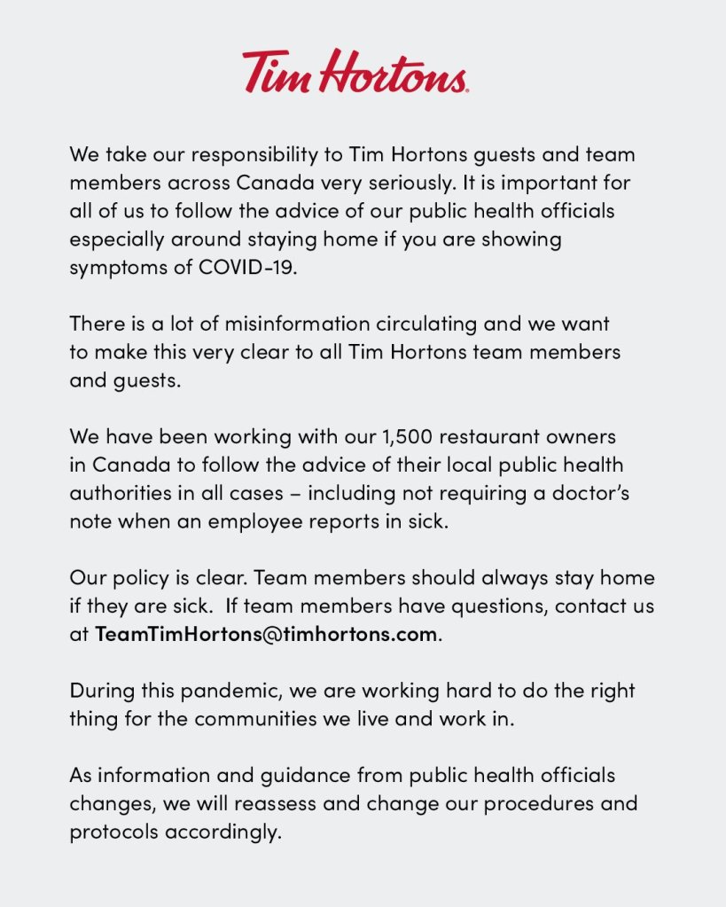 The international response to COVID-19 has stripped down each government, organization, and corporation to reveal exactly what policies they have in place to protect their staff, their clients, and the broader community. And where they are sorely lacking. Take Tim Horton’s, who is under fire for reportedly forcing sick staff to work or get a doctor’s note to return to work, which Tim’s has vehemently denied. But so far they have remained silent about the fact that they enforce this “sick policy” but with no compensation for staff predominantly making less than living wage at stores.